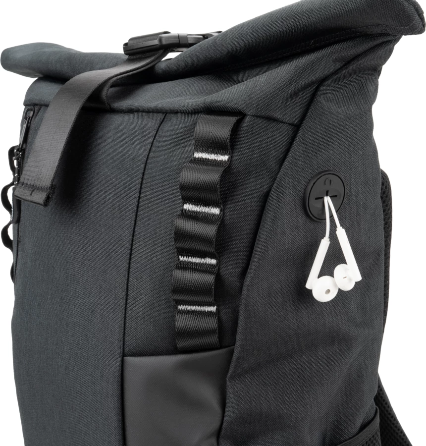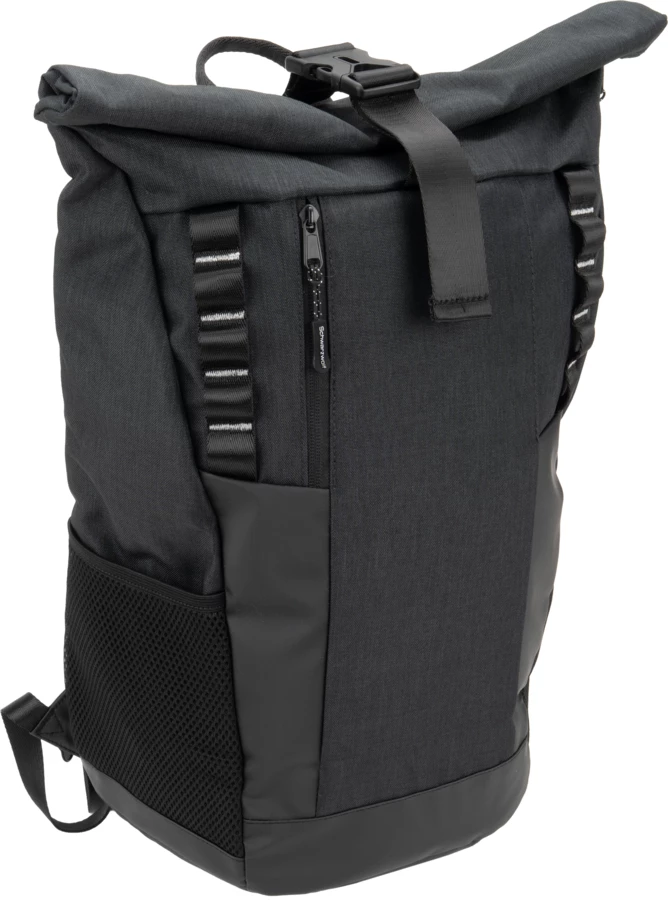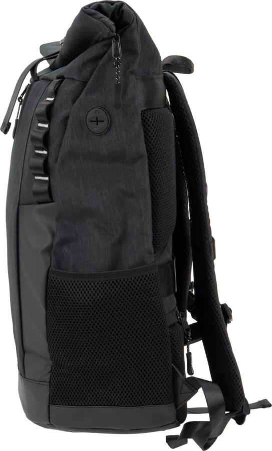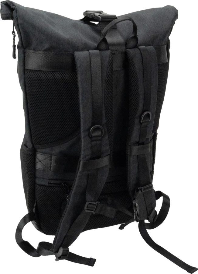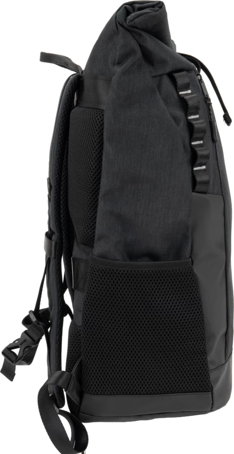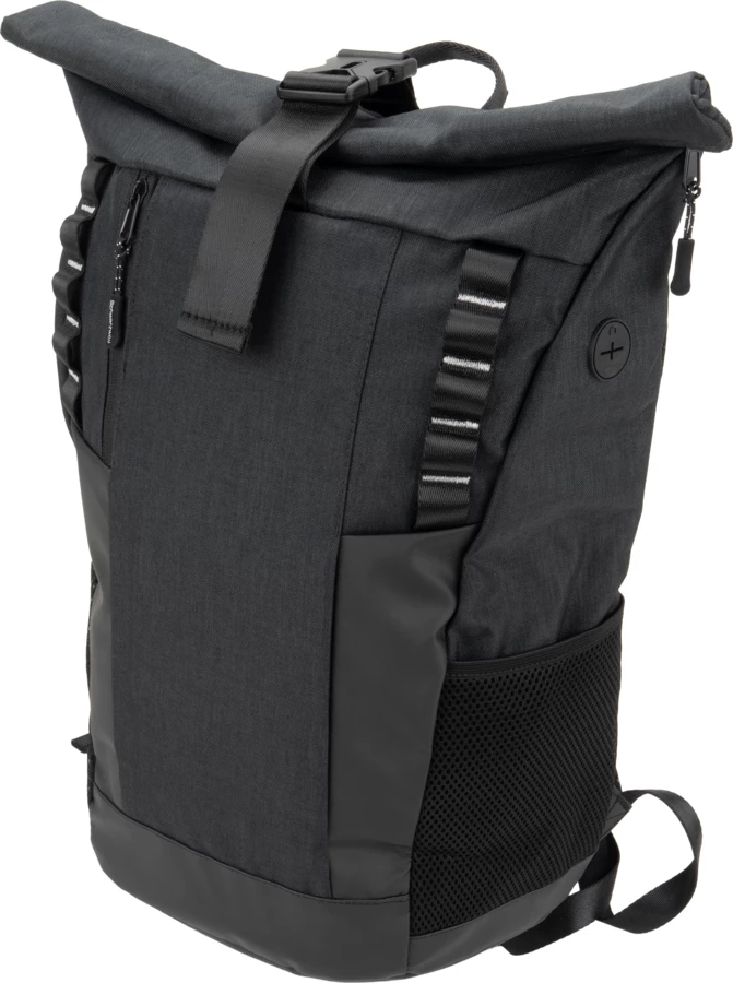 Plecak ze zwijanym zamknięciem, z watowanymi szelkami i plecami, wyposażony w dużą komorę główną z jedną oddzielną kieszenią i mniejszą kieszonką na akcesoria. Z przodu plecaka znajduje się mała kieszonka zamykana na zamek, po bokach dwie siatkowe kieszenie i jedna mała kieszonka z tyłu. Po zrolowaniu górnej części plecaka całość zamykamy dwoma paskami z plastikowymi klamerkami - tak zamknięty plecak będzie miał pojemność 25l. Plecak można również zamknąć bez rolowania, na zamek błyskawiczny - wtedy pomieści 32l.