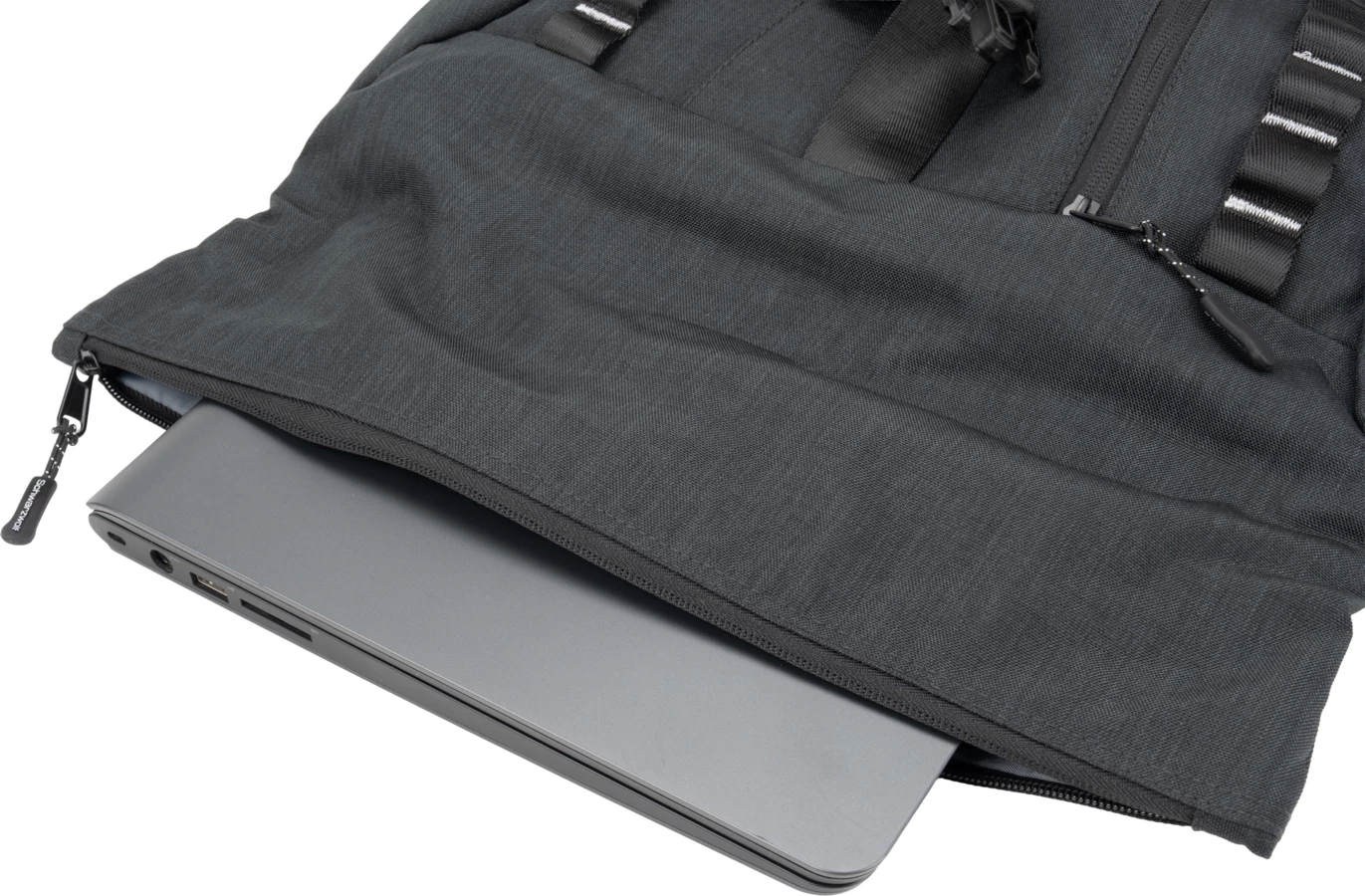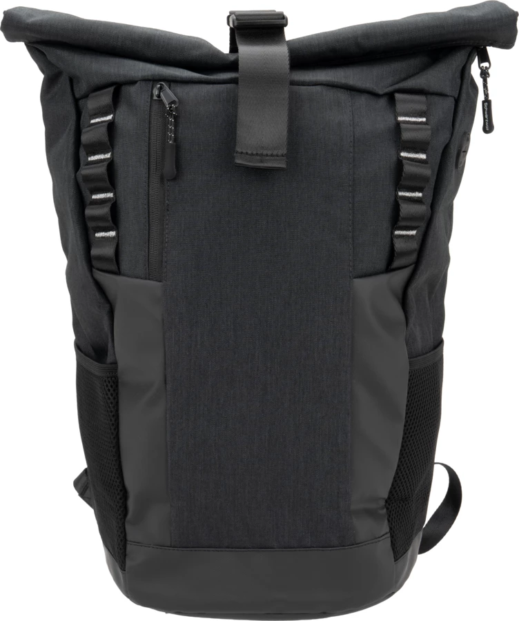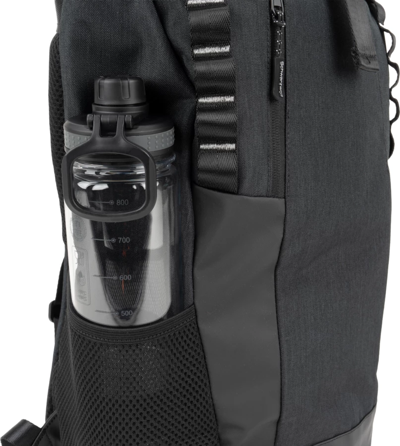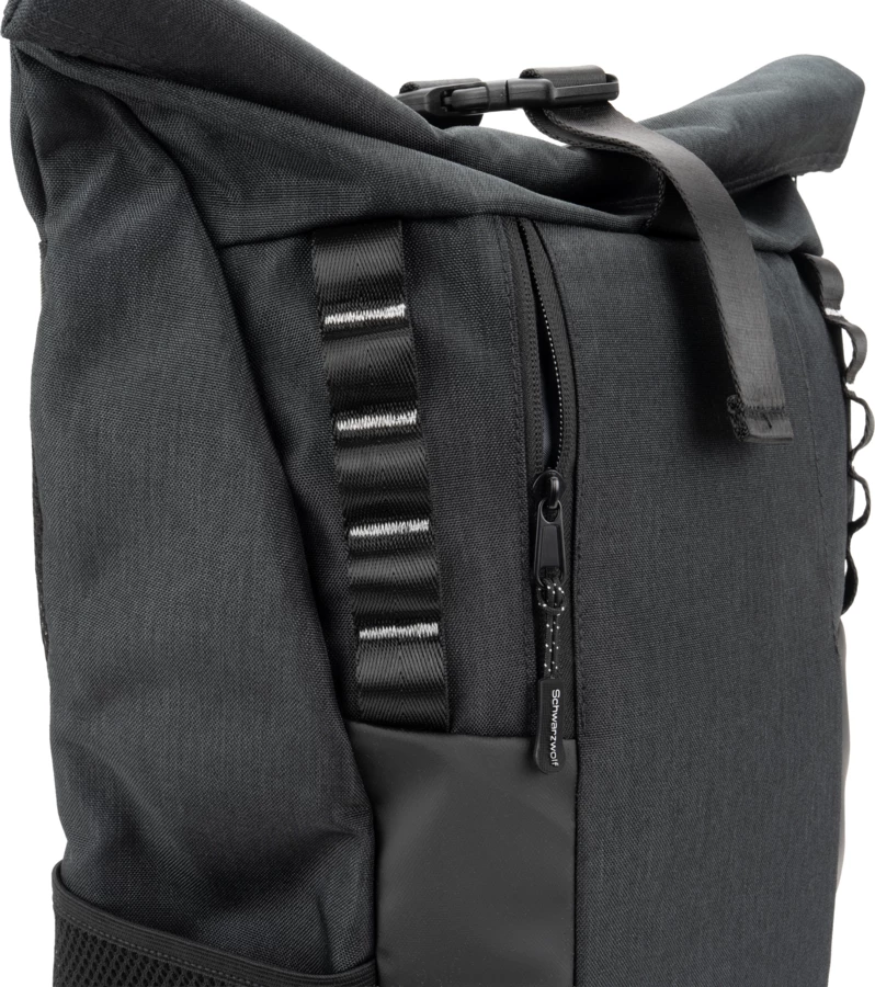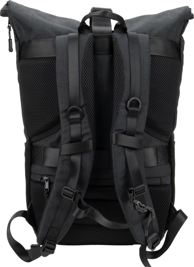 Plecak ze zwijanym zamknięciem, z watowanymi szelkami i plecami, wyposażony w dużą komorę główną z jedną oddzielną kieszenią i mniejszą kieszonką na akcesoria. Z przodu plecaka znajduje się mała kieszonka zamykana na zamek, po bokach dwie siatkowe kieszenie i jedna mała kieszonka z tyłu. Po zrolowaniu górnej części plecaka całość zamykamy dwoma paskami z plastikowymi klamerkami - tak zamknięty plecak będzie miał pojemność 25l. Plecak można również zamknąć bez rolowania, na zamek błyskawiczny - wtedy pomieści 32l.