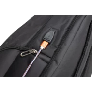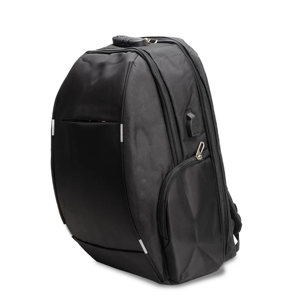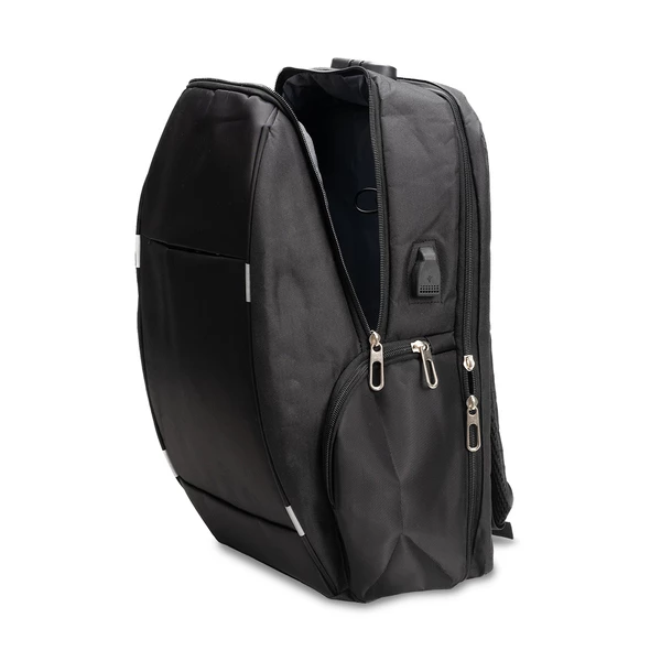 Plecak z przegrodą na laptop 15" zabezpieczoną specjalnym zamknięciem z indywidualnym kodem. Na zewnątrz przednia kieszeń zamykana na zamek, a z boku gniazdo USB, dzięki któremu można podpiąć swój smartfon do powerbanka. Wewnętrzny kabel USB w zestawie. Miękkie wygodne plecy i szelki pokryte są siateczką. Plecak posiada pasek na uchwyt walizki. Plecak uniemożliwia dostęp do niego osobom trzecim.