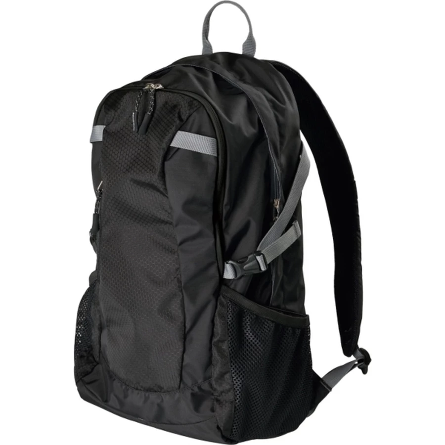 Plecak posiada watowane plecy i szelki z uchwytami, praktyczną kieszeń z zabezpieczeniem na laptop, dwie kieszenie na butelki, taśmy kompresyjne, kieszeń na buty, kieszeń wewnętrzną z przedziałką na drobiazgi oraz karabińczyk. Materiał: 300D nylon, dobby nylon, 210D poliester. Pojemność: 27 l.