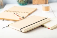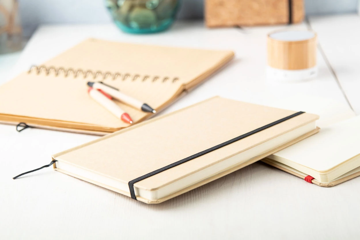 Notizbuch aus recyceltem Karton mit 100 Seiten (blanko), farbigem Lesezeichen und Gummiband.