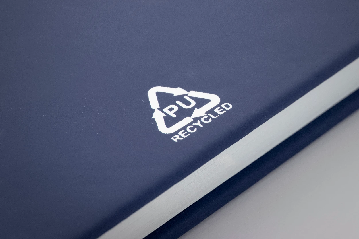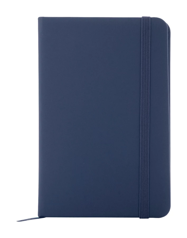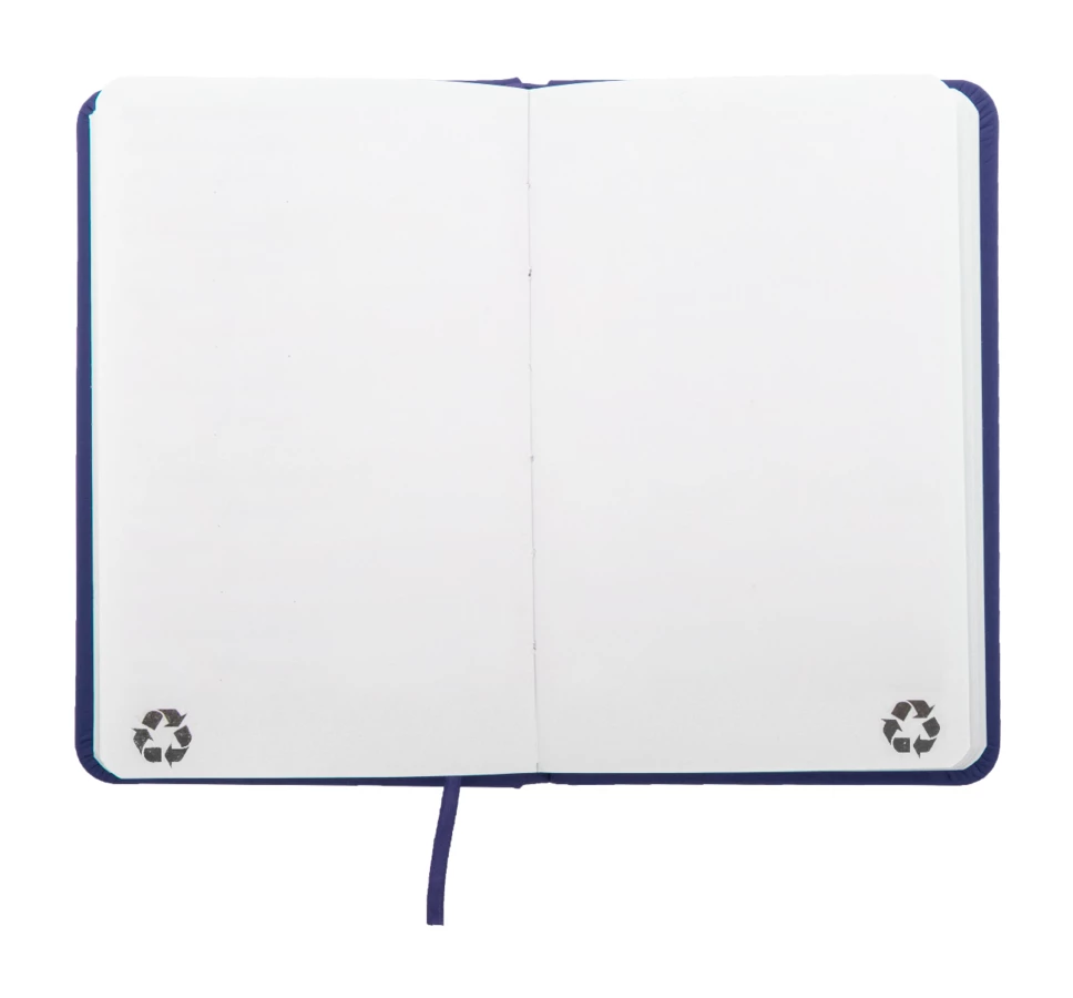 Notizbuch mit recyceltem PU-Lederbezug und 100 blanko Blättern aus Recyclingpapier. Mit farblich passendem Lesezeichen und Gummiband. A6-Größe.