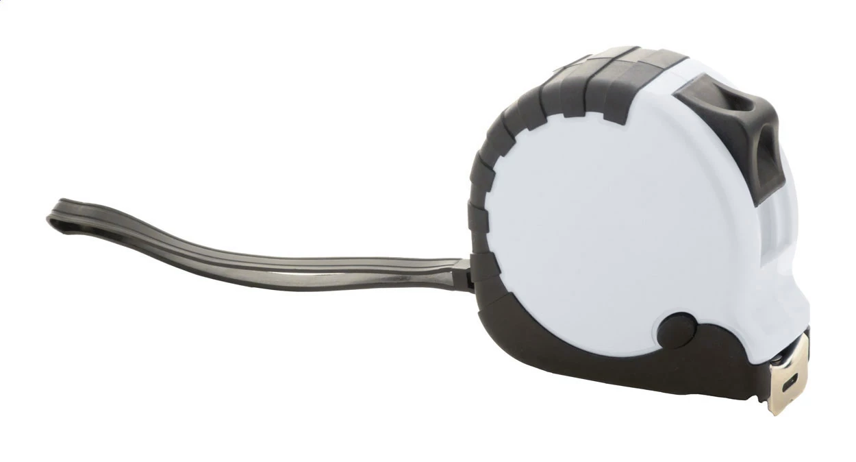 Maßband aus recyceltem ABS Kunststoff mit Stopper, Metallklip und Handschlaufe. Länge: 5 m.
