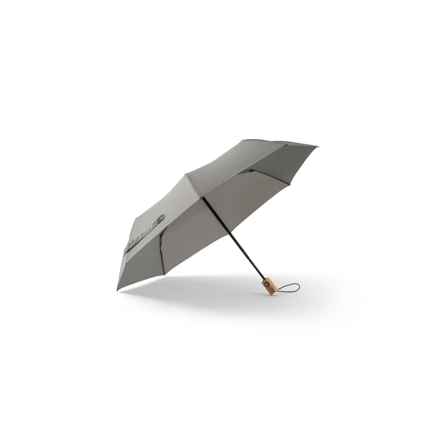Automatik Taschenschirm aus recyceltem Polyester (100% rPET) 190T Pongé mit Fiberglas-Speichen und Holzgriff. Dieser Regenschirm lässt sich 3fach schliessen, ist windfest und ist mit automatischer Öffnung und Schließung ausgestattet. Geliefert in einer Hülle. Regenschirm: ø990 x 285 mm | Beutel: ø55 x 240 mm