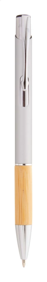 Aluminium-Kugelschreiber mit Bambus-Griffzone, gummierter Oberfläche und spezieller Beschichtung für eine Spiegelgravur, blauschreibend.