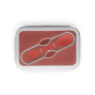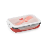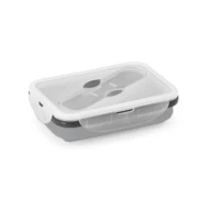 Faltbare hermetische Frischhaltebox aus Silikon und PP. Kapazität bis zu 640 mL. Auf dem Deckel befindet sich ein Fach mit einem 2-in-1 Besteck, bestehend aus Gabel und Löffel (im Lieferumfang enthalten). Die Frischhaltebox ist für den Mikrowellengebrauch geeignet, wobei der Deckel vorher entfernt werden muss. 160 x 110 x 66 mm | Gefalten: 160 x 110 x 40 mm
