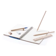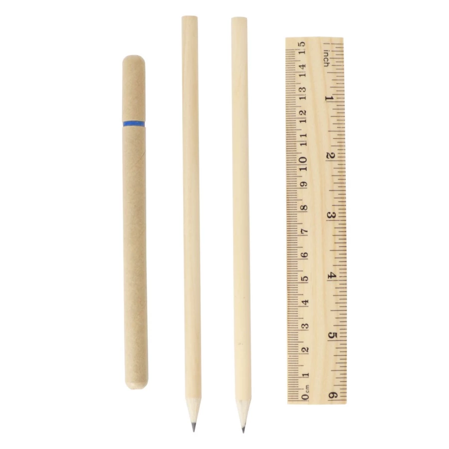 Schulset, Notizbuch (ca. A5, 70 Bl., leer), Federtasche mit Reißverschluss, Kugelschreiber, Schaft aus recyceltem Karton, 2 Buntstifte, Lineal, Anspitzer und Radiergummi