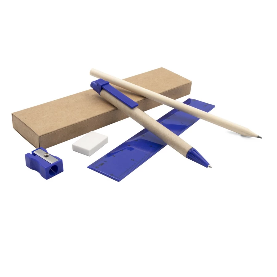 Schulset in einer Schachtel, komplett mit: Bleistift, Kugelschreiber mit Schaft aus recyceltem Karton (blaue Mine), Lineal (15 cm), Radiergummi und Spitzer, Produkt aus recyceltem Karton