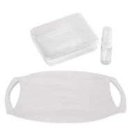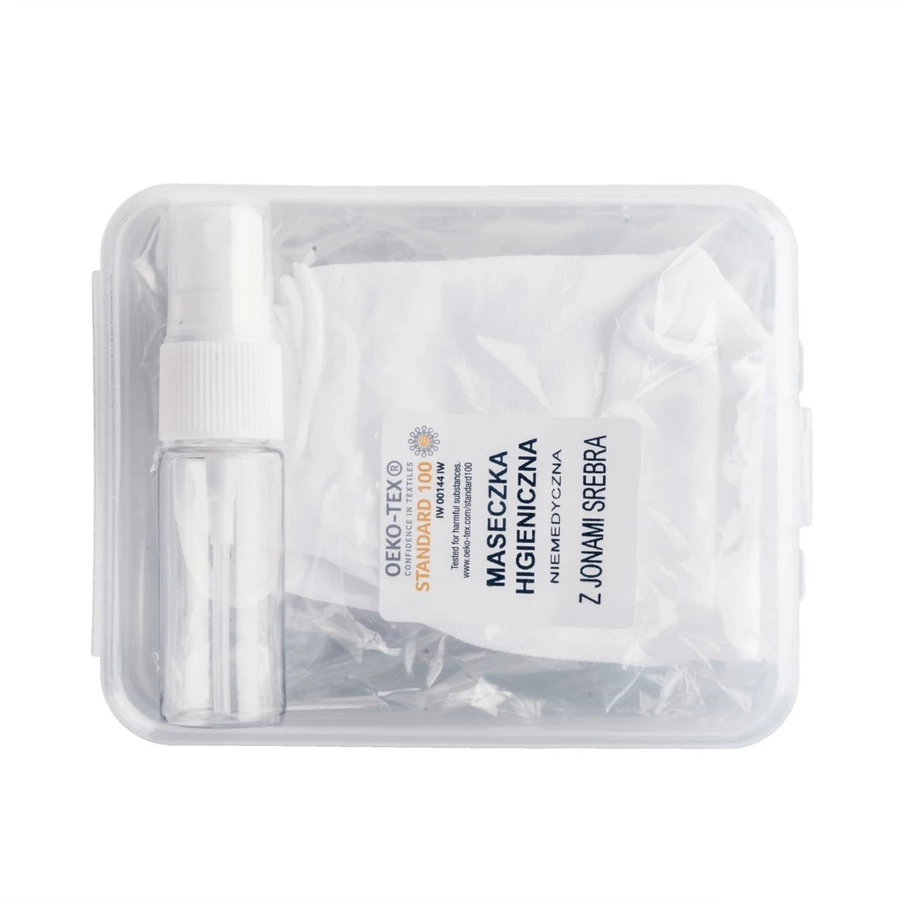 Set in einer transparenten Box, Flasche 15 ml für Desinfektionsmittel, wiederverwendbare Maske mit Silberionen, nicht medizinisch, hat Platz für den Filter, hergestellt aus 100% Polyamid 250 g/m2, Silberionen halten bis zu 20 Wäschen, Waschtemperatur bis 90 Grad Celsius, hergestellt in Polen