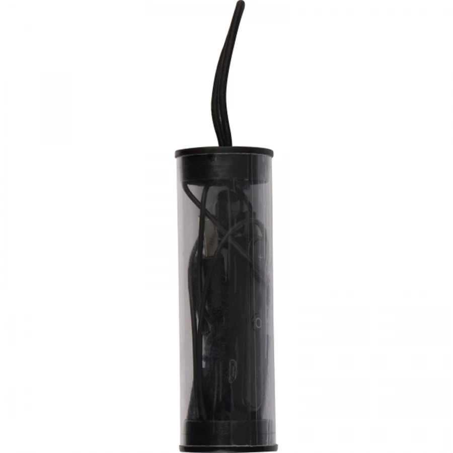 Plastikowe słuchawki bezprzewodowe (Bluetooth) z regulacją głośności i kablem z portem USB do ładowania. Całość umieszczona w plastikowym opakowaniu ze sznurkiem.