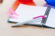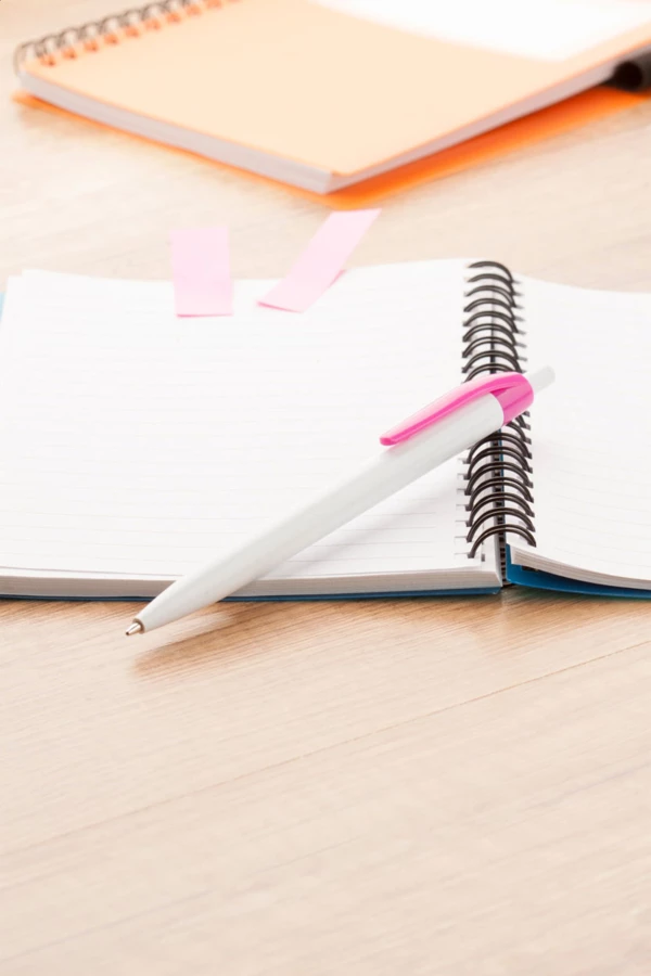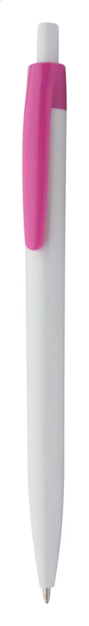 Weißer Kunststoff-Kugelschreiber mit farbigem Clip, blauschreibend.