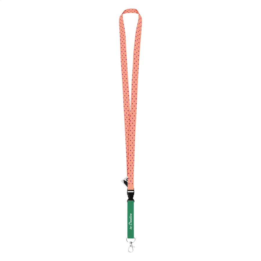 Individuelles Lanyard aus RPET, 15mm breit, mit abnehmbaren Metallkarabiner. Der Preis ist inkl. Sublimationsdruck auf beiden Seiten. Mindestmenge: 100 Stk.