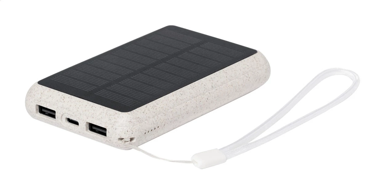 USB-Powerbank im ökologischen Weizenstroh-Kunststoffgehäuse mit eingebautem Solarladegerät und 5000 mAh Akku. Mit 2 USB- und 1 USB-C-Ladeanschluss. USB-C-Eingangsanschluss.