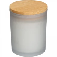 Świeczka dekoracyjna w szklanym pojemniku z bambusowym wieczkiem. Świeczka pakowana w kartonik.