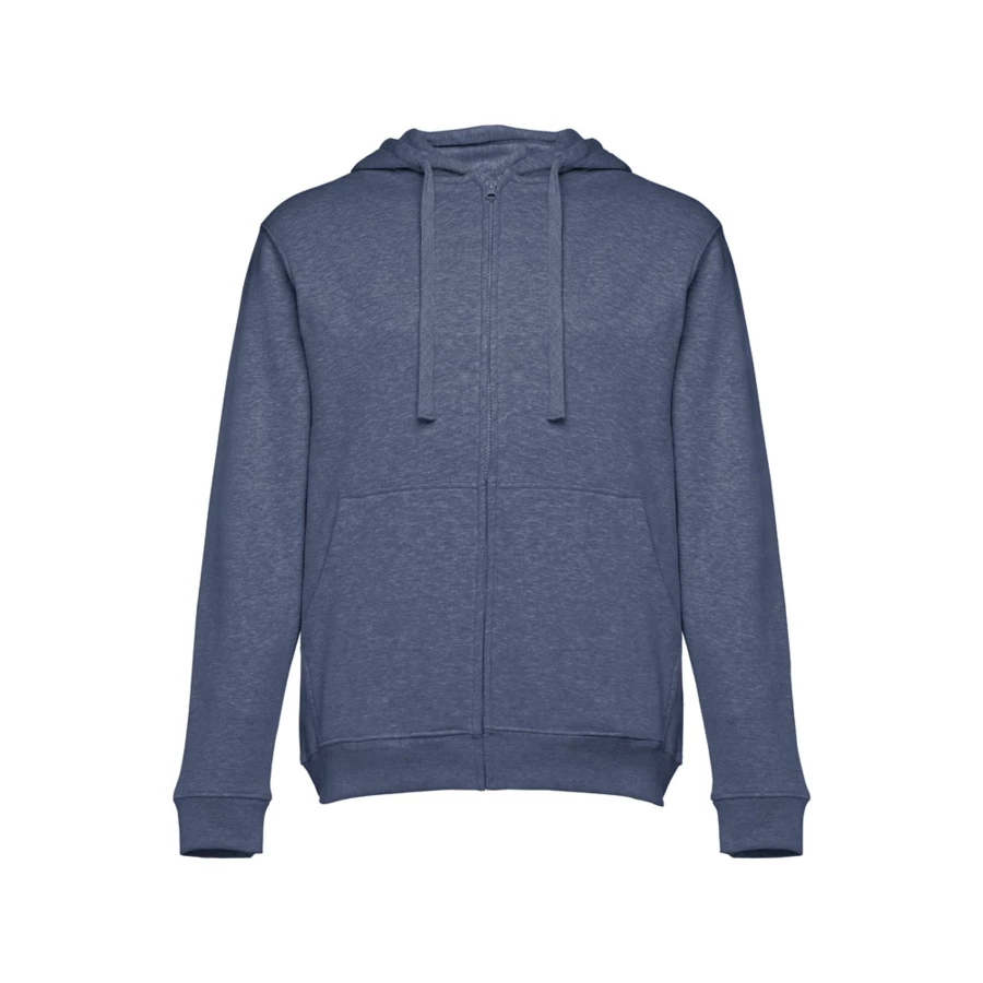 Herren Sweatjacke aus 50% Baumwolle und 50% Polyester (320g/m²) mit Reißverschluss und gefütterter Kapuze mit Kordelzug. Kardiert mit 2 Kängurutaschen, einem verdeckten Kunststoffreißverschluss und einem gerripten Bund. Größen: S, M, L, XL, XXL