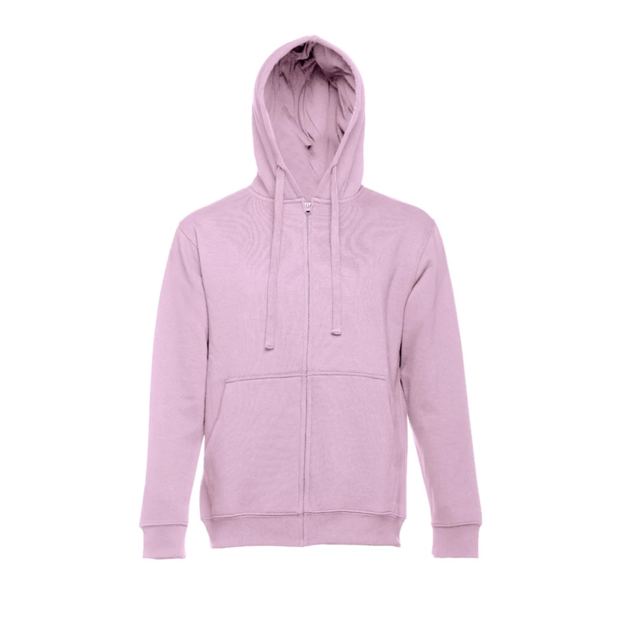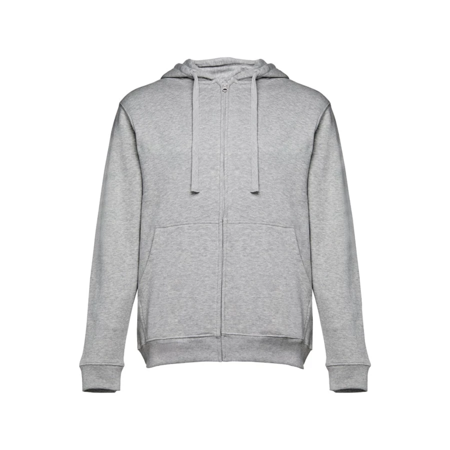 Herren Sweatjacke aus 50% Baumwolle und 50% Polyester (320g/m²) mit Reißverschluss und gefütterter Kapuze mit Kordelzug. Kardiert mit 2 Kängurutaschen, einem verdeckten Kunststoffreißverschluss und einem gerripten Bund. Größen: S, M, L, XL, XXL