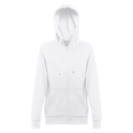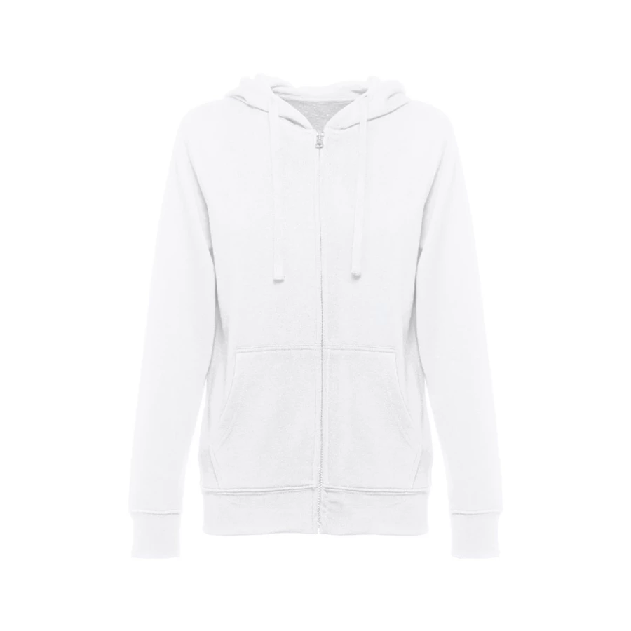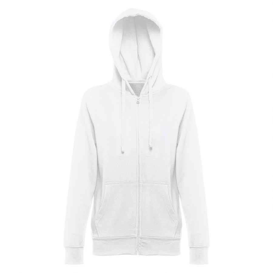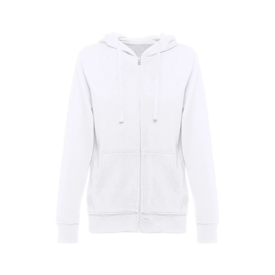 Damen Sweatshirt aus 50% Baumwolle und 50% Polyester (320 g/m²) mit kardierter Innenseite. Die Kapuze ist gefüttert und hat eine farblich abgestimmte Kordel. Auf der Vorderseite befinden sich 2 Beuteltaschen mit verdecktem Plastikreissverschluss. Ripp an Bund und Ärmeln. Größen: S, M, L, XL, XXL