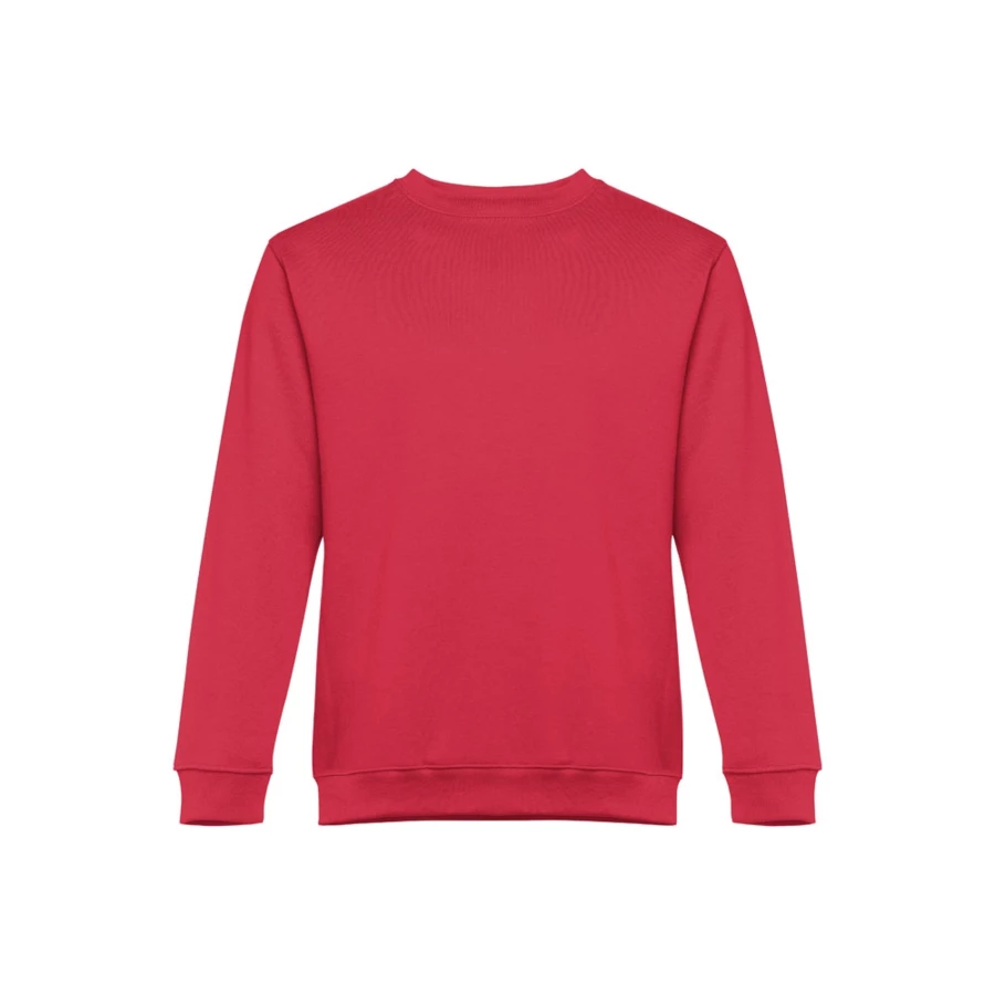 Sweatshirt aus 50% Baumwolle und 50% Polyester (300g/m²), unisex. Innen kardiert, 1x1 Ripp, Bund am Ärmel und Saum, Doppelnaht und Verstärkungsband am Kragen. Größen: S, M, L, XL, XXL