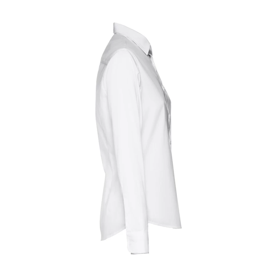 Damen langarm Popeline Bluse aus 68% Baumwolle, 28% Polyamid und 4% Elasthan (115g/m²), tailliert mit verstellbaren Manschetten mit 1 Knopf, 1 Rückenfalte und 1 Knopfleiste mit 7 farblich abgestimmten Knöpfen. Größen: S, M, L, XL, XXL