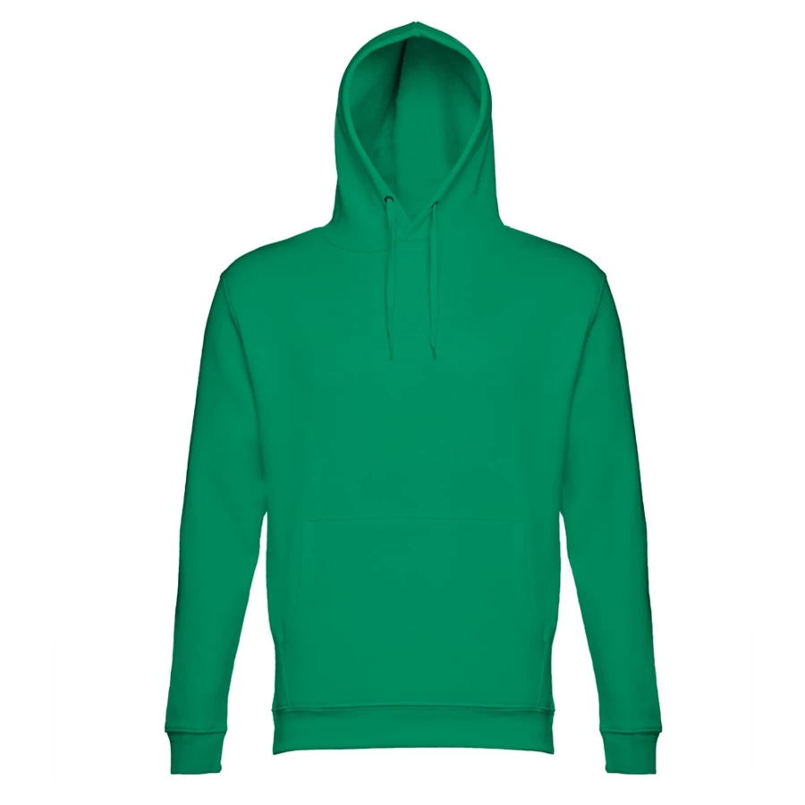 Sweatshirt aus 50% Baumwolle und 50% Polyester (320g/m²), unisex mit einer Kapuze mit Kordelzug. Innen kardiert, 1x1 Ripp, Bund an Ärmel und einer Kängurutasche. Größen: XS, S, M, L, XL, XXL