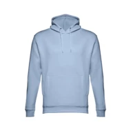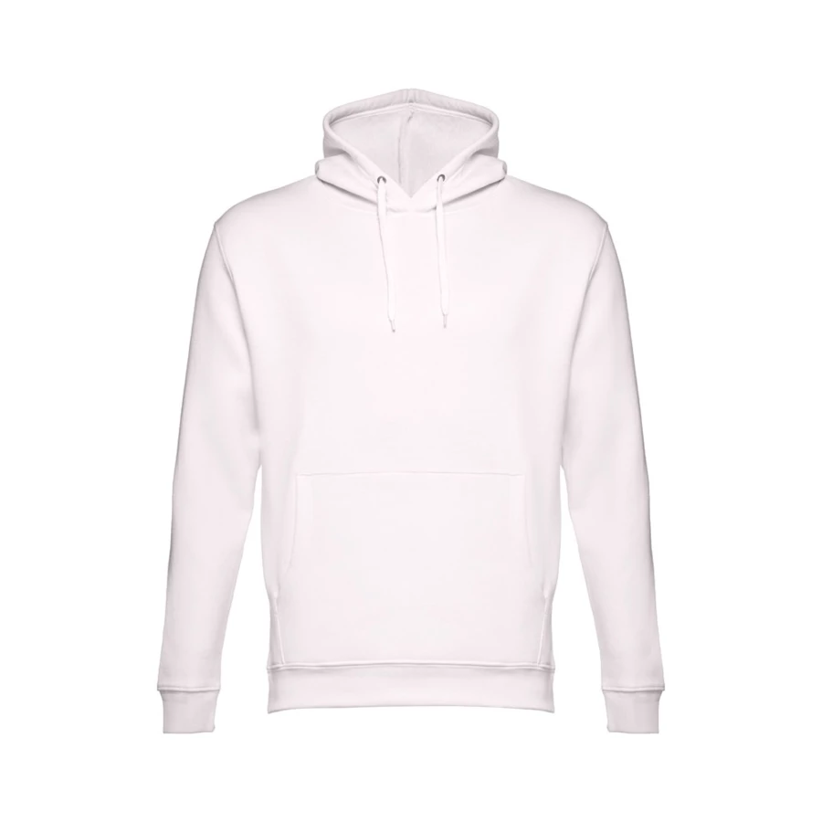 Sweatshirt aus 50% Baumwolle und 50% Polyester (320g/m²), unisex mit einer Kapuze mit Kordelzug. Innen kardiert, 1x1 Ripp, Bund an Ärmel und einer Kängurutasche. Größen: XS, S, M, L, XL, XXL