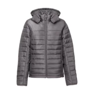 Damen-Kapuzenjacke aus 100% recyceltem Nylon-Ripstop (350 g/m²) mit einem Innenfutter aus 100% recyceltem Nylontaft (350 g/m²) für mehr Tragekomfort. Die Kapuze ist gepolstert und hat verschiedene Funktionen: elastisches Band, zwei Druckknöpfe und einen abnehmbaren Reißverschluss. Vorderer Reißverschluss aus YKK®- eine Marke, die moderne Ausrüstung mit hoher Qualitätskontrolle verwendet. Es hat zwei Vordertaschen mit Reißverschlüssen und Anhänger, sowie zwei Innentaschen mit selbstklebenden Reißverschlüssen. Auf der Rückseite befindet sich ein Reißverschluss für eine einfache Personalisierung. Größen: XS, S, M, L, XL, XXL