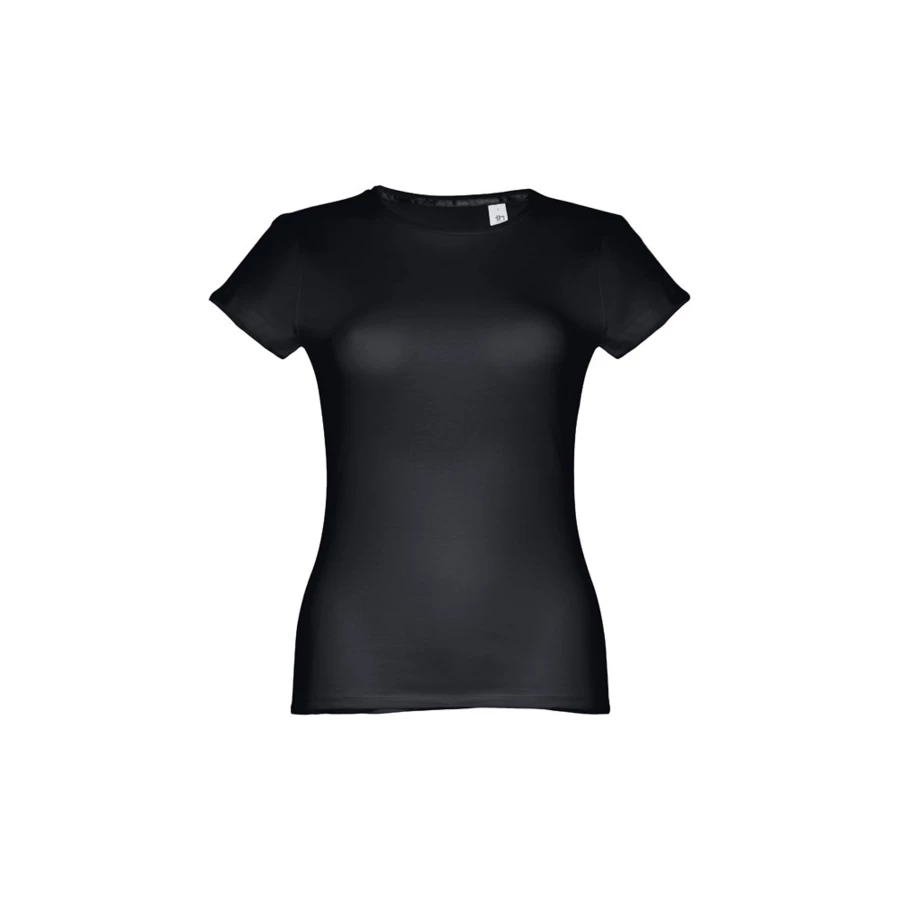 Damen T-Shirt aus 100% Strickjersey und Baumwolle (150g/m²) mit kardiertem Baumwollfaden, tailliert. Dieses hat einen dünnen Jersey-Kragen mit Satin-Verstärkungsband und eine Doppelnaht an Ärmeln und Saum. Bei der Farbe 183 bestehend aus 90% Baumwolle und 10% Viskose und Farbe 196 bestehend aus 98% Baumwolle und 2% Viskose. Größen: S, M, L, XL, XXL