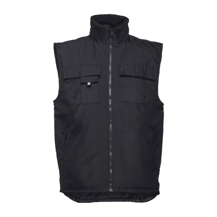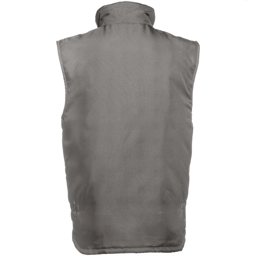 Herren Arbeitsweste aus 100% Polyester mit Acrylbeschichtung (170g/m²), gepolstert und gefuttert. Innenseite aus 100% Polyester-Taft (65g/m²) mit Polar Fleece Kragen. Die Weste hat 6 Taschen, 5 Taschen auf der Vorderseite davon 2 Taschen mit Reißverschluss, 1 Tasche für das Handy und 1 Innentasche. Elastisches Band an den Seiten. Der Reißverschlusszugang auf der Rückseite vereinfacht die Veredelung. Größen: S, M, L, XL, XXL, 3XL