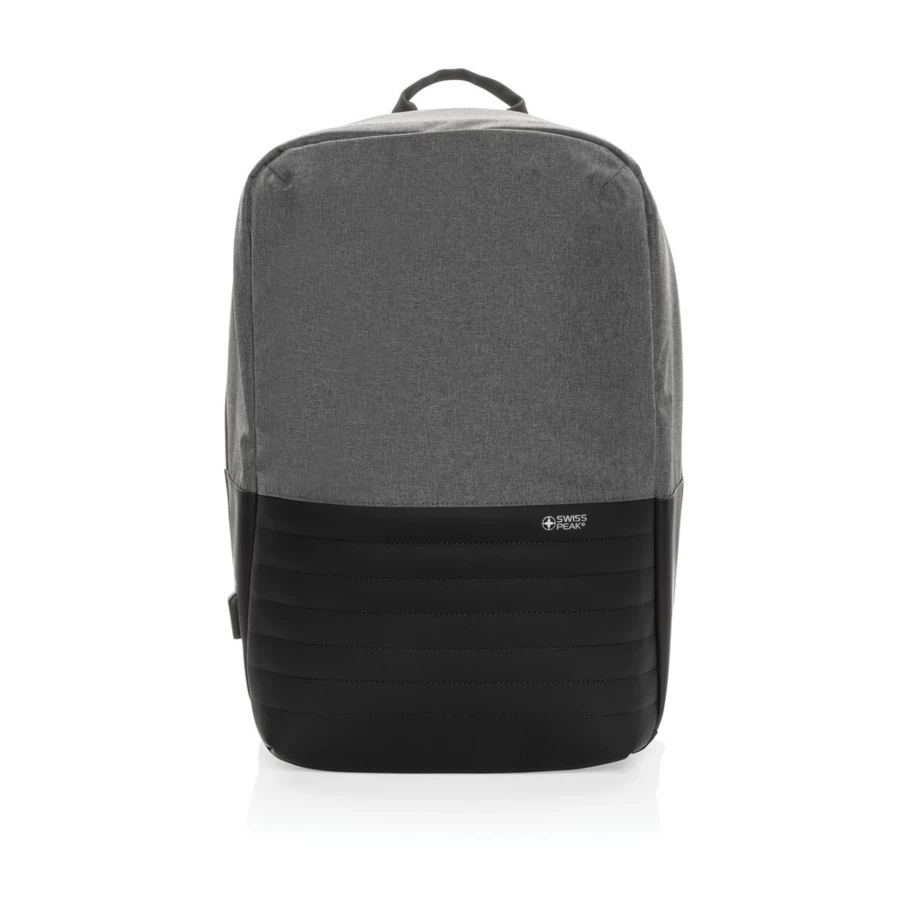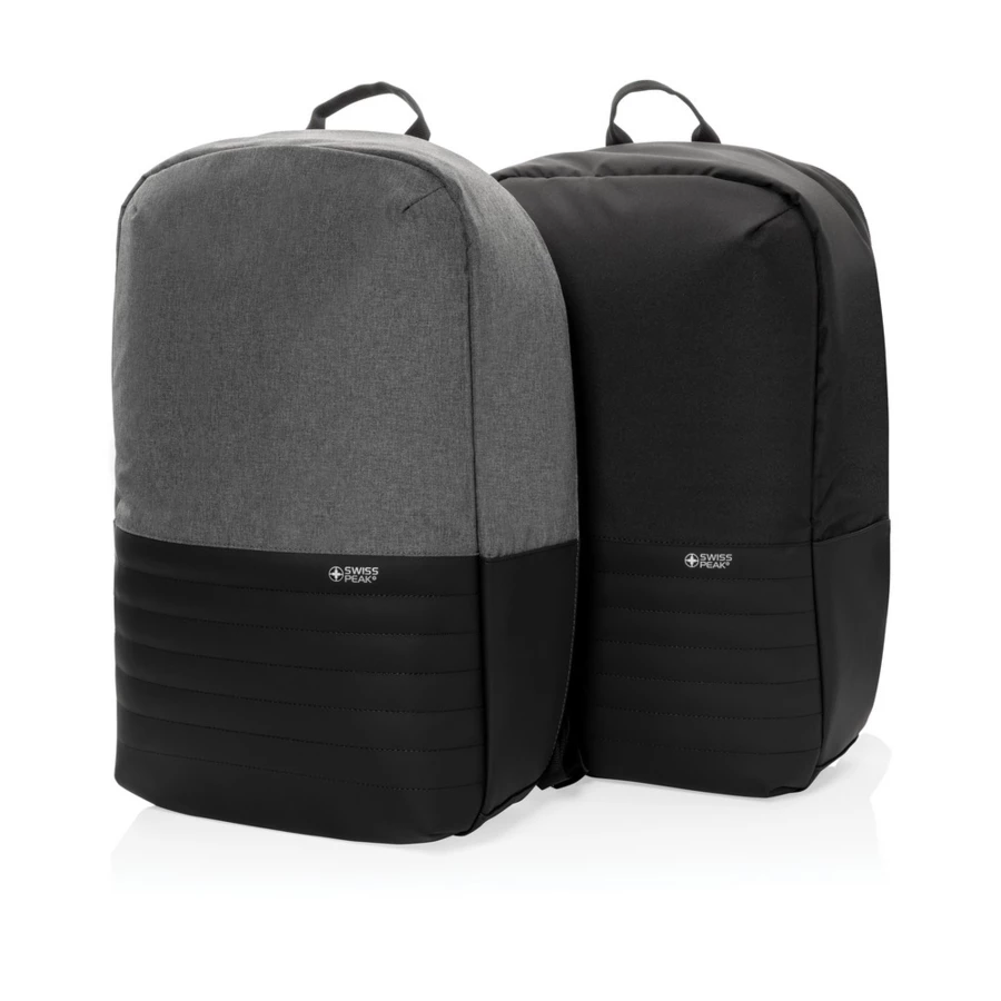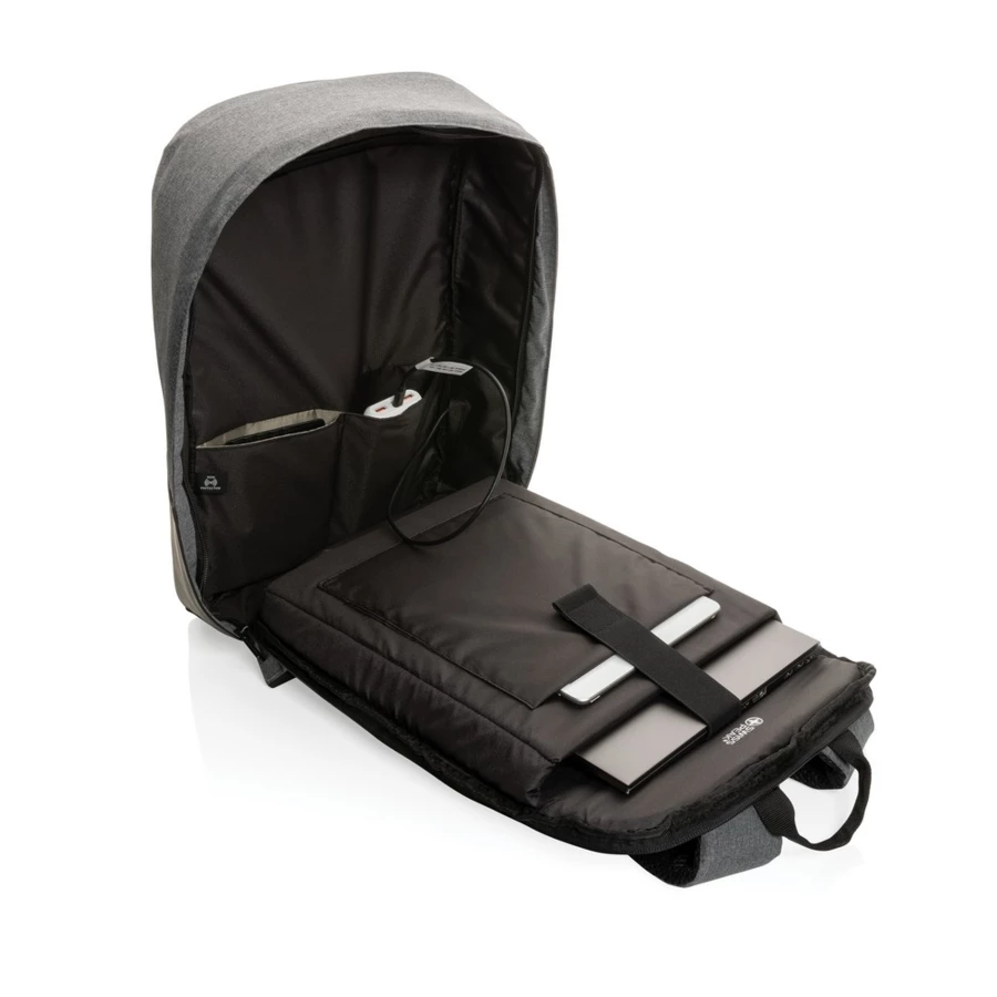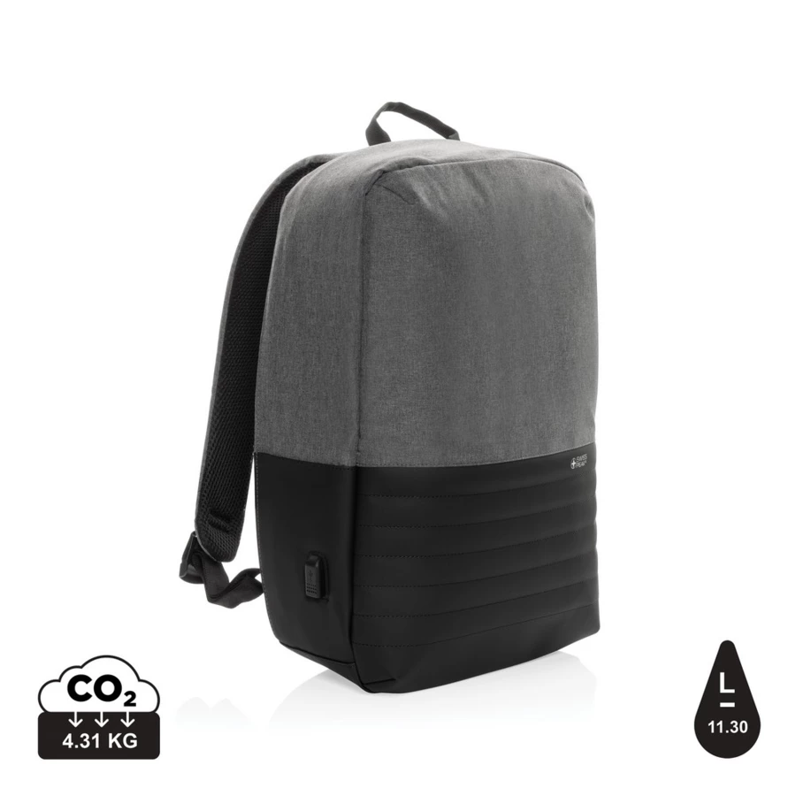 This Swiss Peak AWARE™ 15.6" laptop backpack with anti-theft back opening makes it easy to carry your tech gadgets and personal items out and about. The inner features a laptop and tablet compartment. RFID safe pockets for your wallet and passport. Connect your power bank easily to the integrated USB charging port and charge your phone or tablet on the go. Hidden easy access back pocket. With AWARE™ tracer that validates the genuine use of recycled materials. Each bag saves 12.4 litres of water on average and has reused 20.8 PET bottles. 2% of proceeds of each Aware™ product sold will be donated to Water.org.