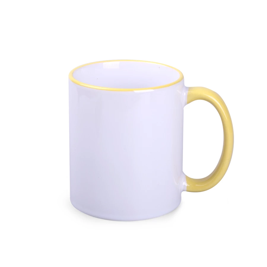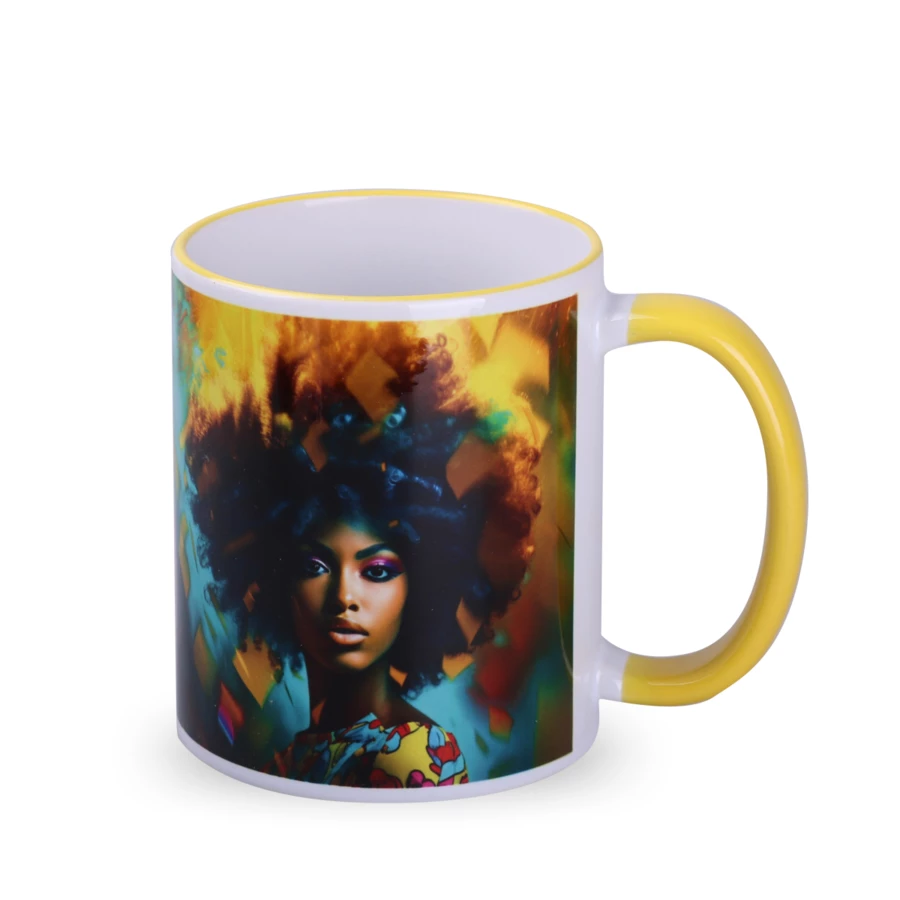 Ein außergewöhnlich farbenfroher Sublimationsbecher mit einer einfachen Form. Perfekt für das Aufbringen von Drucken in Fotoqualität. Das Besondere daran sind die in vielen Farben gefärbten Felgen und Ohren.