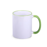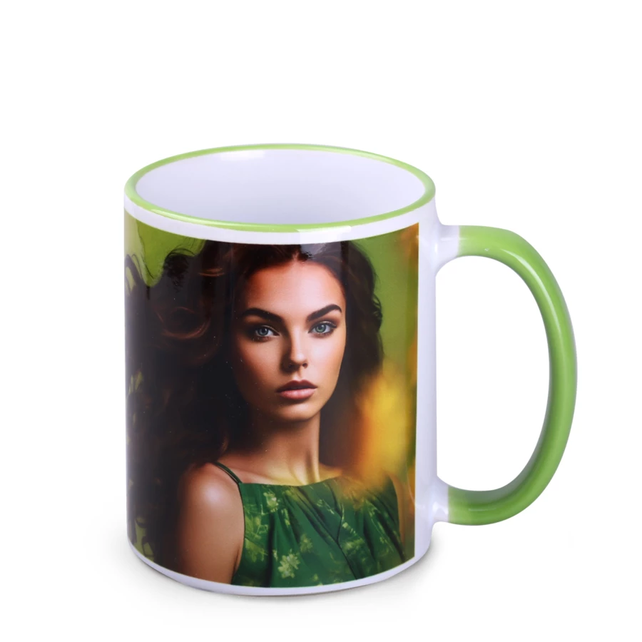 Ein außergewöhnlich farbenfroher Sublimationsbecher mit einer einfachen Form. Perfekt für das Aufbringen von Drucken in Fotoqualität. Das Besondere daran sind die in vielen Farben gefärbten Felgen und Ohren.