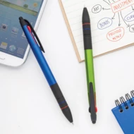 Kunststoff-Kugelschreiber mit Touchpen, Gummi-Griffzone, matter Metallic-Oberfläche und drei unterschiedlichen Minen (schwarz, blau und rot).