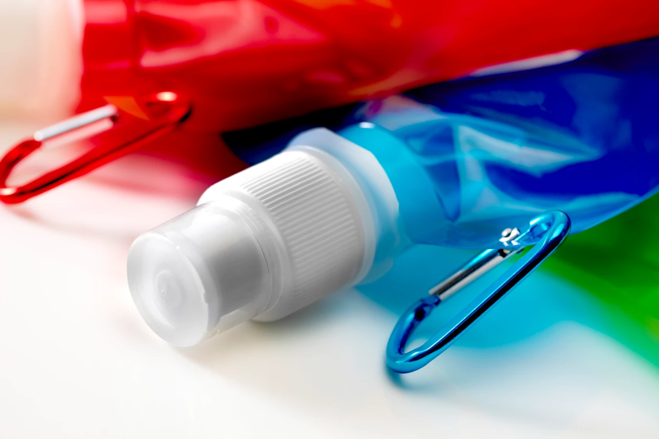 Faltbare Flasche 420 ml mit Karabinerhaken zum Anhängen, transparenter (außer -02 und -32) Ausgießer zum einfachen Trinken, passt zusammengefaltet sogar in eine Tasche