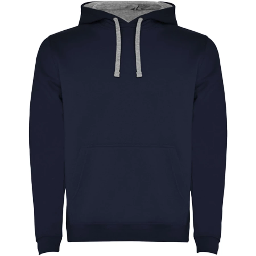 Kapuzenpullover mit doppeltem Stoff, verstellbarem Kordelzug in Kontrastfarbe, verstärkten und verdeckten Nähten am Kragen und Kängurutasche. Verfügbar in Zweifarbig und Uni. Elastischer 1×1-Rippstrick an Ärmeln und Bund. Abnehmbares Etikett. Das Modell ist 185 cm groß und trägt Größe M.