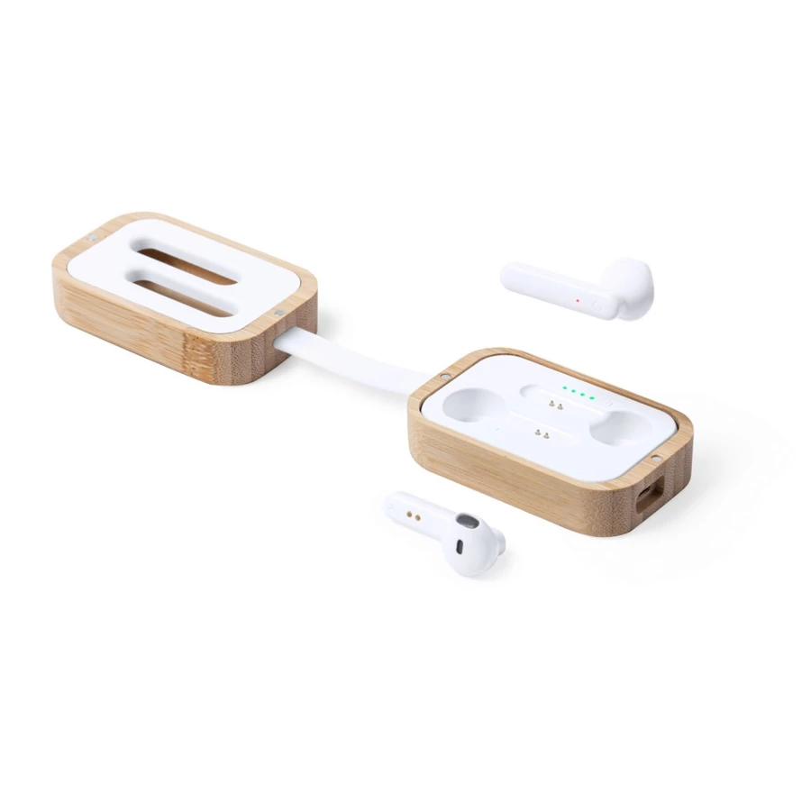 Wireless Kopfhörer BT 5.0 im magnetischen Ladeetui aus Bambus, 400 mAh Akku der Ladestation, 35 mAh Akku der Ohrhörer, Betriebsdauer: ca. 2.5h, Anrufannahmefunktion, integriertes Mikrofon, Reichweite bis zu 10 m, USB aufladbar, Micro-USB-Kabel inklusive