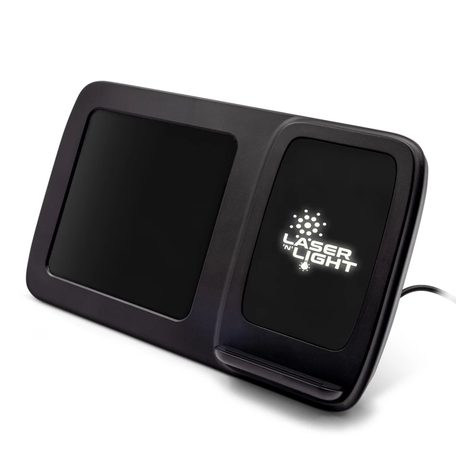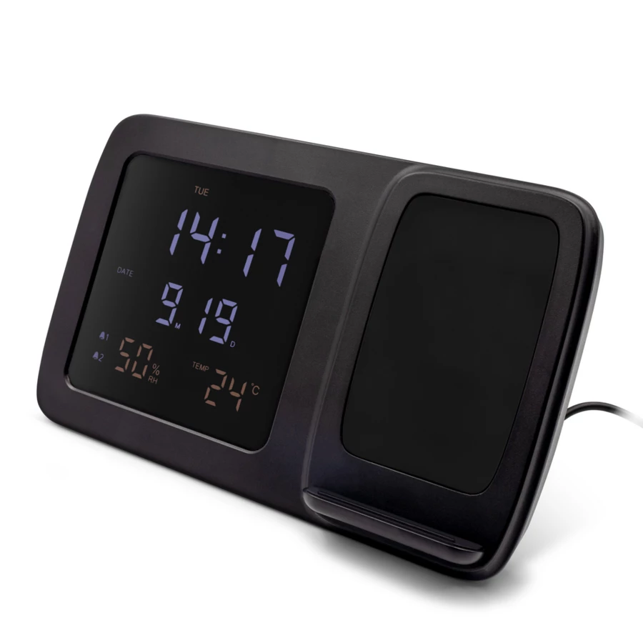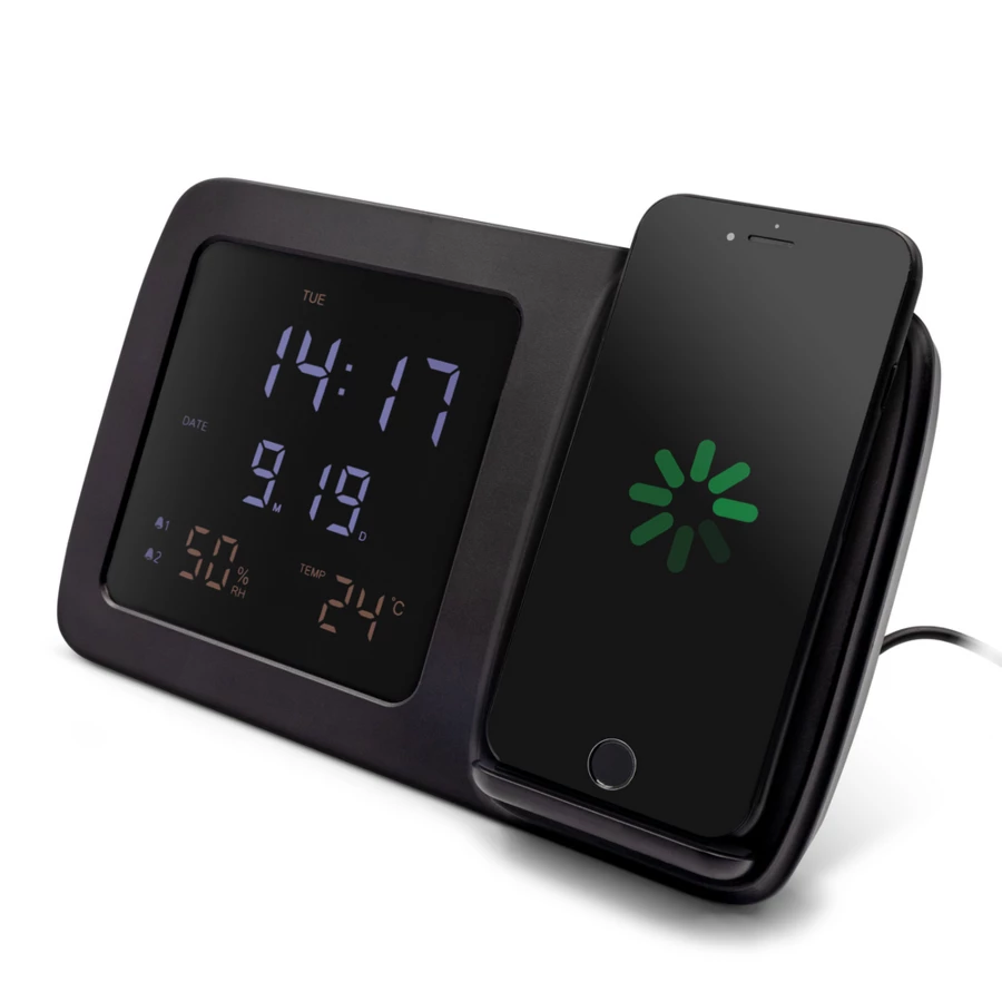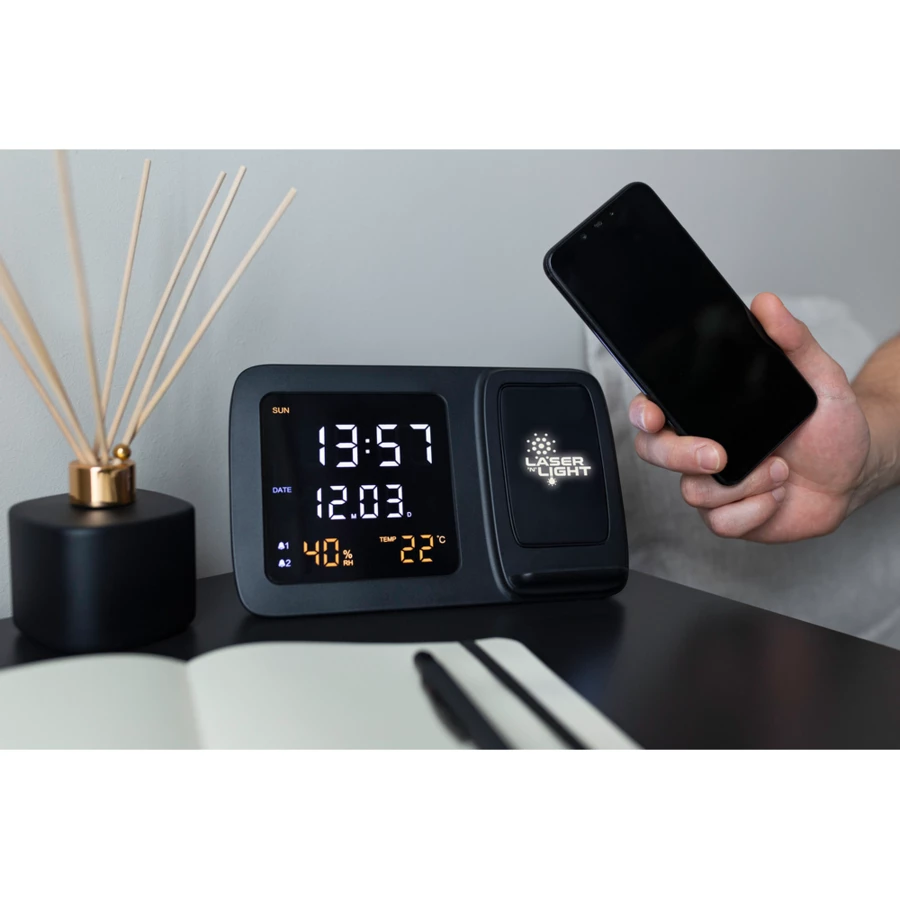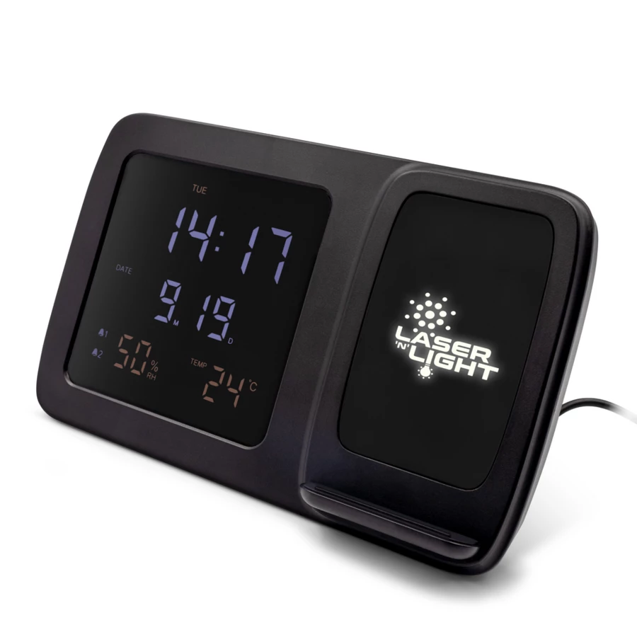 Wireless Ladegerät 5W-15W Exclusive Collection, integrierte Digitaluhr, Funktionen: Alarm, Temperatur- und Luftfeuchtigkeitsinformationen, Uhrzeit und Datum, funktioniert mit Geräten mit induktiver Ladefunktion, Hintergrundbeleuchtungseffekt nach der Gravur, USB-C Kabel im Lieferumfang enthalten