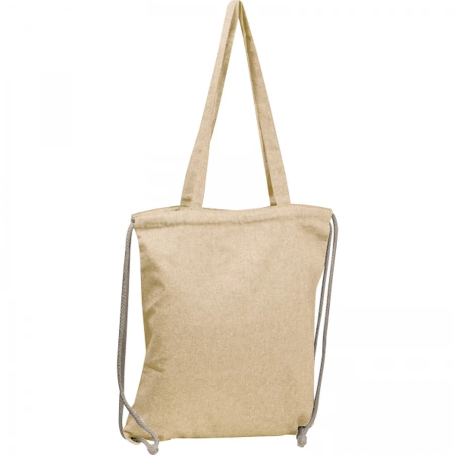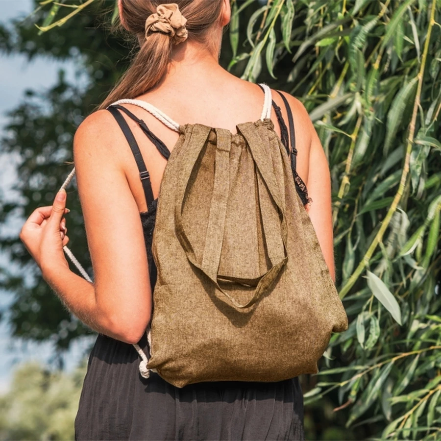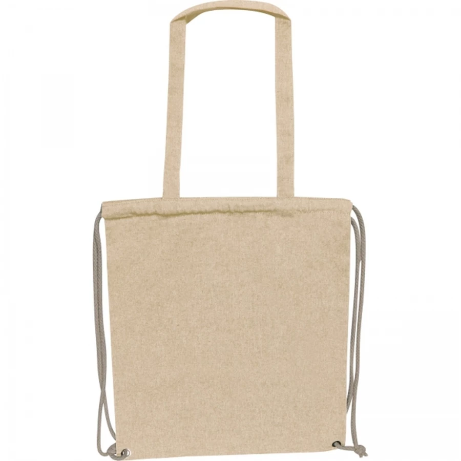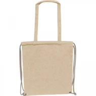 Bawełniana torba-worek z bawełny pochodzącej z recyklingu, z certyfikatem Oeko-Tex STANDARD 100, o gramaturze 140g/m². Torba posiada długie uchwyty do noszenia na ramieniu i sznurki do zamykania i noszenia na plecach.