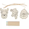 Zestaw zawieszek choinkowych wykonanych z drewna. W zestawie znajdują się 3 różne wzory - mikołaj, bałwanek i renifer oraz kredki, którymi można ozdobić zawieszki.