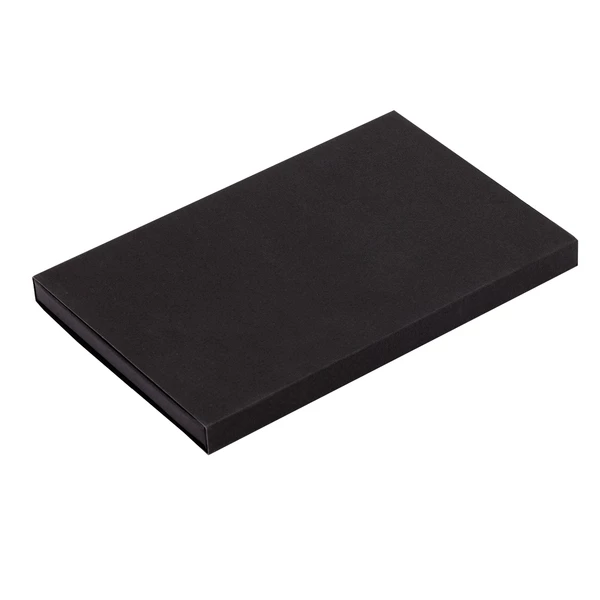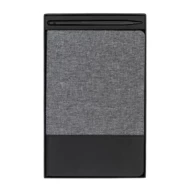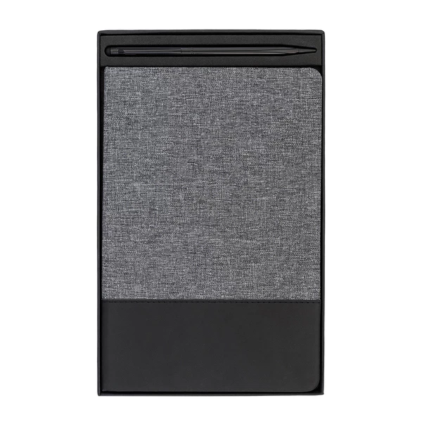 Zestaw składający się z notesu i długopisu. Notatnik A5 w twardej oprawie pokrytej tkaniną i ekoskórą z tasiemką do zaznaczania strony oraz elastyczną gumką chroniącą wnętrze. 80 kartek w kratkę, gramatura papieru 70 g/m2. Długopis aluminiowy z rysikiem do obsługi ekranów dotykowych, wyposażony w niebieski wkład. Zestaw pakowany w czarne upominkowe pudełko.
