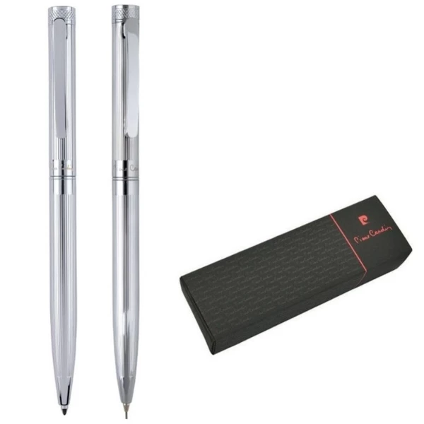 Najwyższej jakości Zestaw piśmienniczy składający się z długopisu piszącego na niebiesko (1 mm) i ołówka (grafit 0,5 mm) pochodzących z kolekcji RENEE. Przybory piśmienne wykonane z metalu z chromowanymi elementami. Zestaw zapakowany w eleganckie pudełko prezentowe z certyfikatem autentyczności Pierre Cardin.