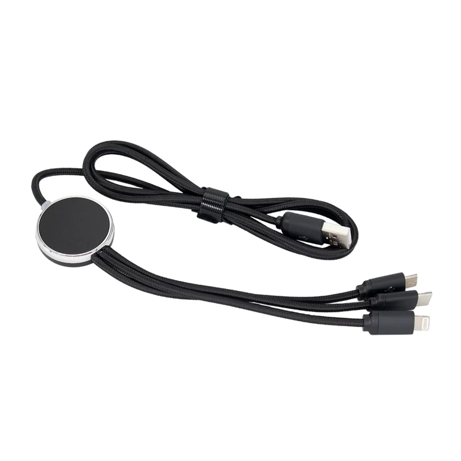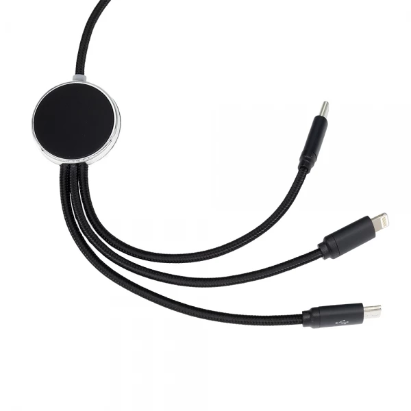 Long (120cm) cable for charging, includes 3 plugs: micro USB, lightning and type-C. Engraved logotype is enlightened when the cable is in use.Specification:Fast Charging (5V 2A output)