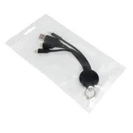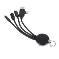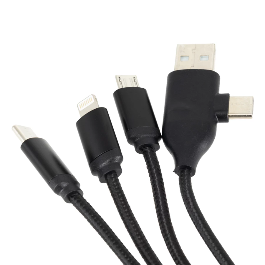 Cable for charging, includes 4 plugs: micro USB, lightning and type-C x2. Engraved logotype is enlightened when the cable is in use.