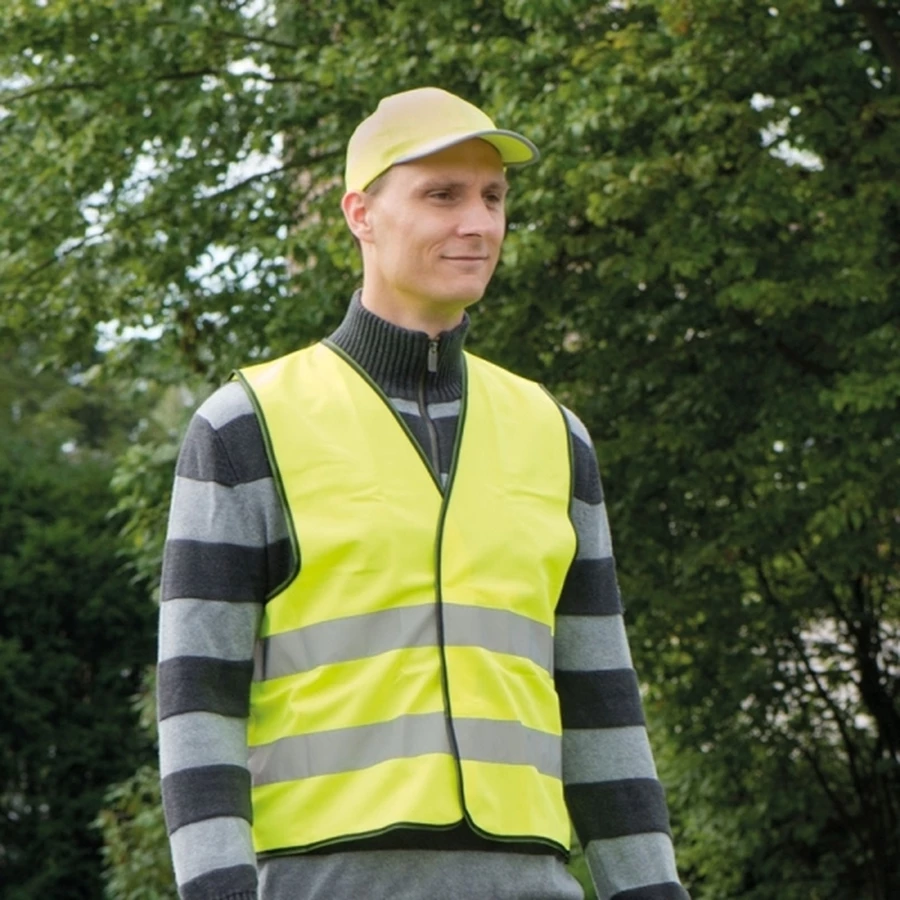 Baseball cap made of polyester with reflective piping on the visor. We print your logo on the center of the forehead.