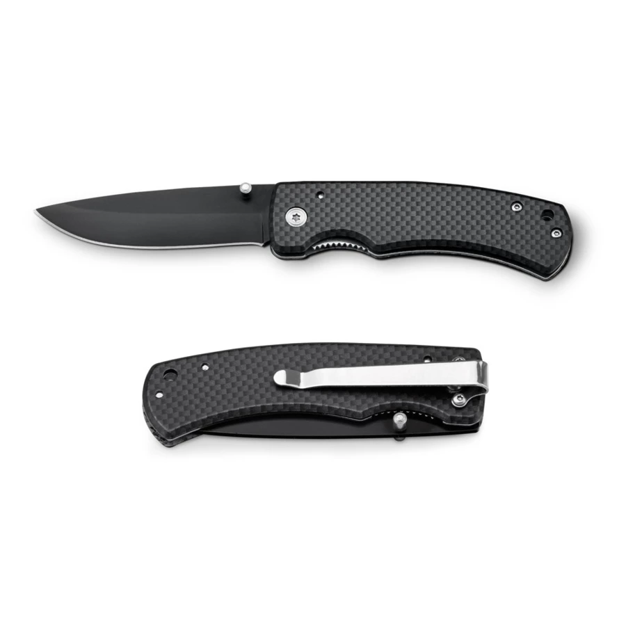Carbon fiber coated aluminum pocket knife, stainless steel blade with safety lock and clip. Supplied in a gift box. 97 x 15 x 29 mm | Box: 110 x 37 x 20 mm