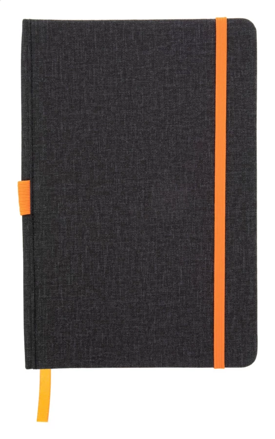 Textured PU leather covered notebook with matching bookmark, rubber band and pen holder. 96 lined sheets, A5 size.