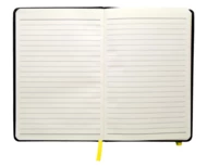 Textured PU leather covered notebook with matching bookmark, rubber band and pen holder. 96 lined sheets, A5 size.