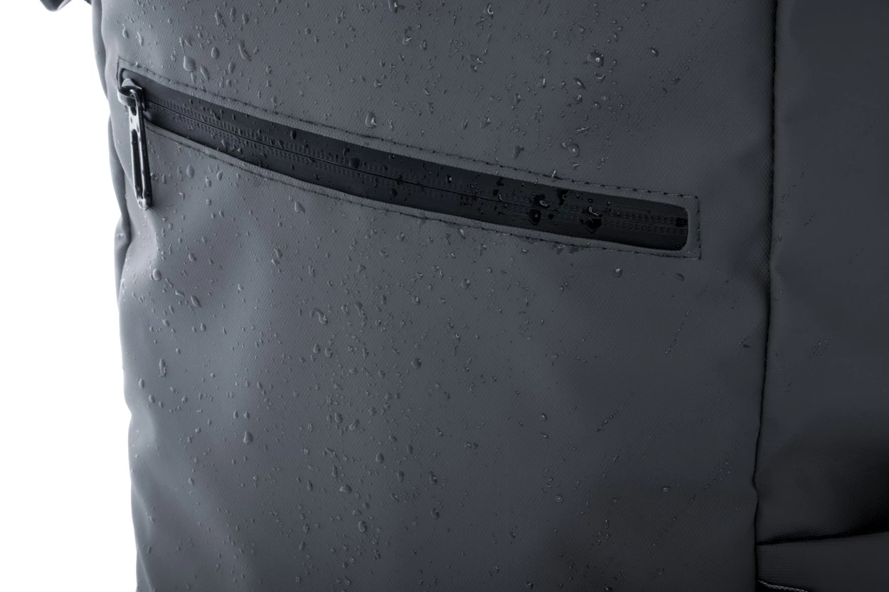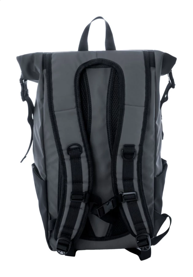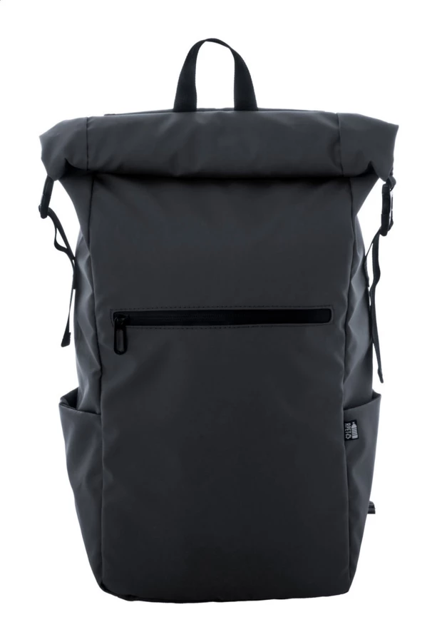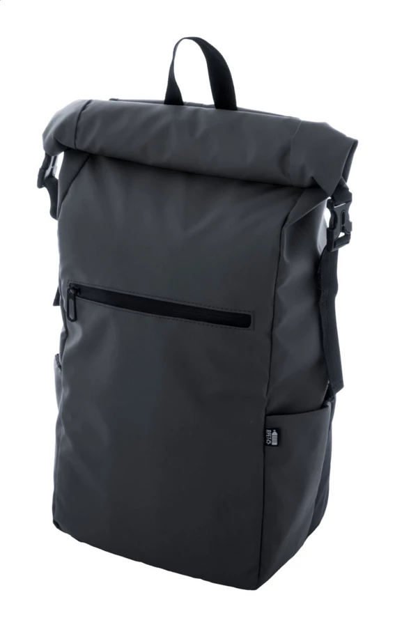 Waterproof, rolltop backpack in RPET with buckle and velcro closure, padded laptop (16") and tablet (10") compartment, zipped front pocket, side pockets, padded back and shoulder straps. PU coated 600D RPET polyester, with distinctive RPET label.