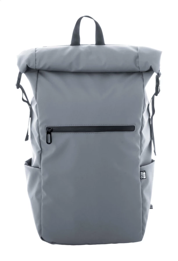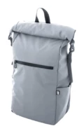 Waterproof, rolltop backpack in RPET with buckle and velcro closure, padded laptop (16") and tablet (10") compartment, zipped front pocket, side pockets, padded back and shoulder straps. PU coated 600D RPET polyester, with distinctive RPET label.