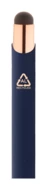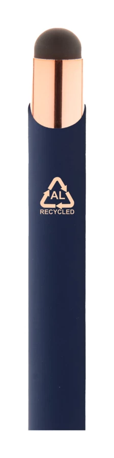 Recycled aluminium ballpoint and touch screen pen with rubberized finish and rose gold details. With special coating for mirror laser engraving in rose gold colour. With blue refill.