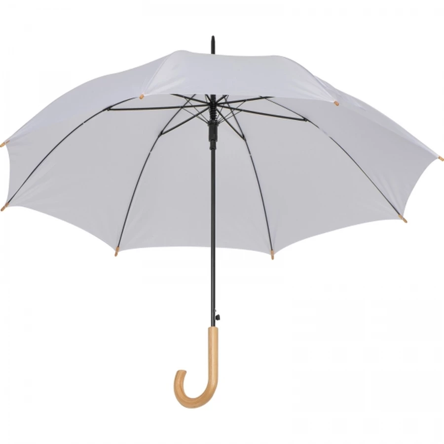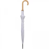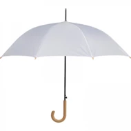 Automatic umbrella made of 190T poliester with curved drewnoen handle and drewnoen tips.